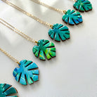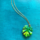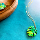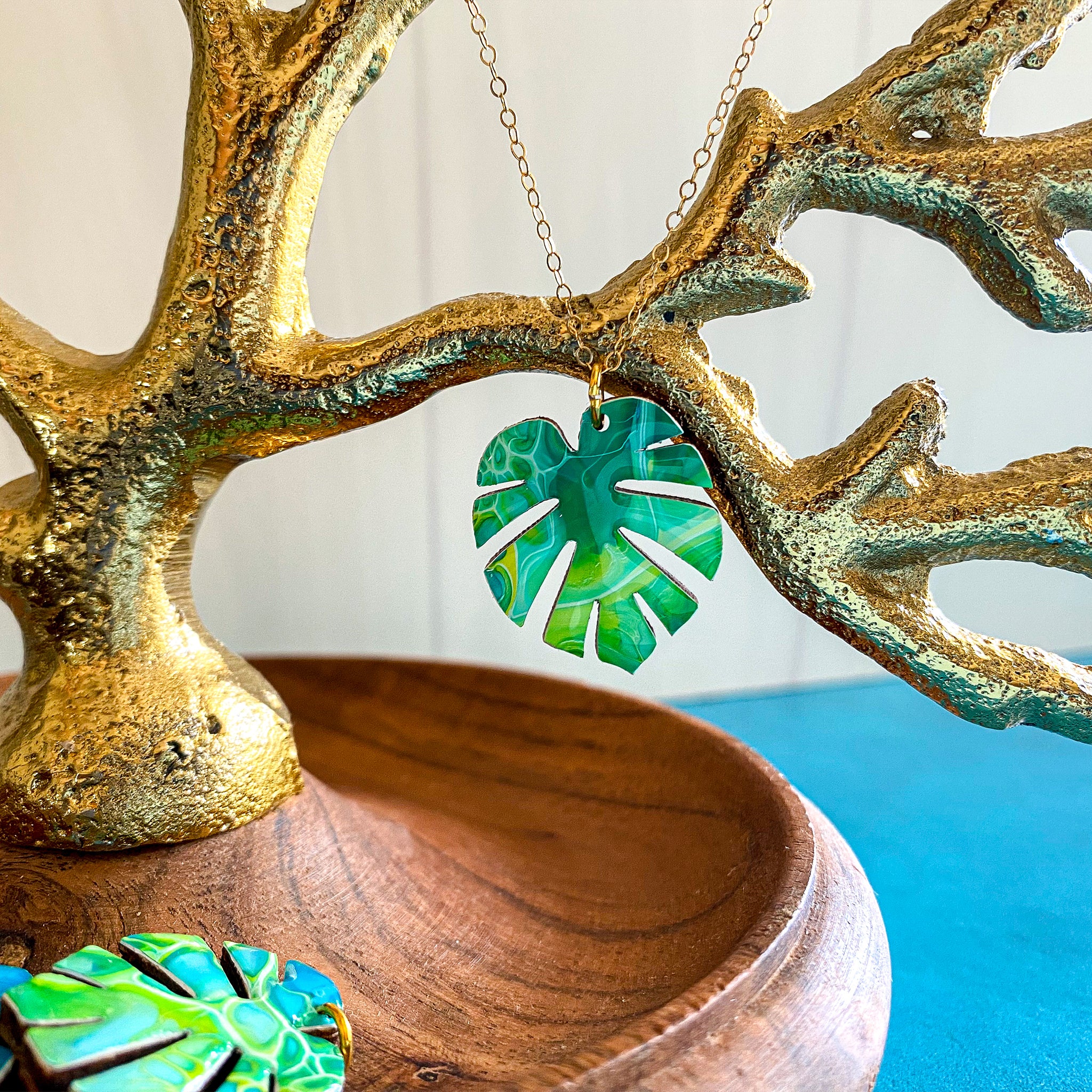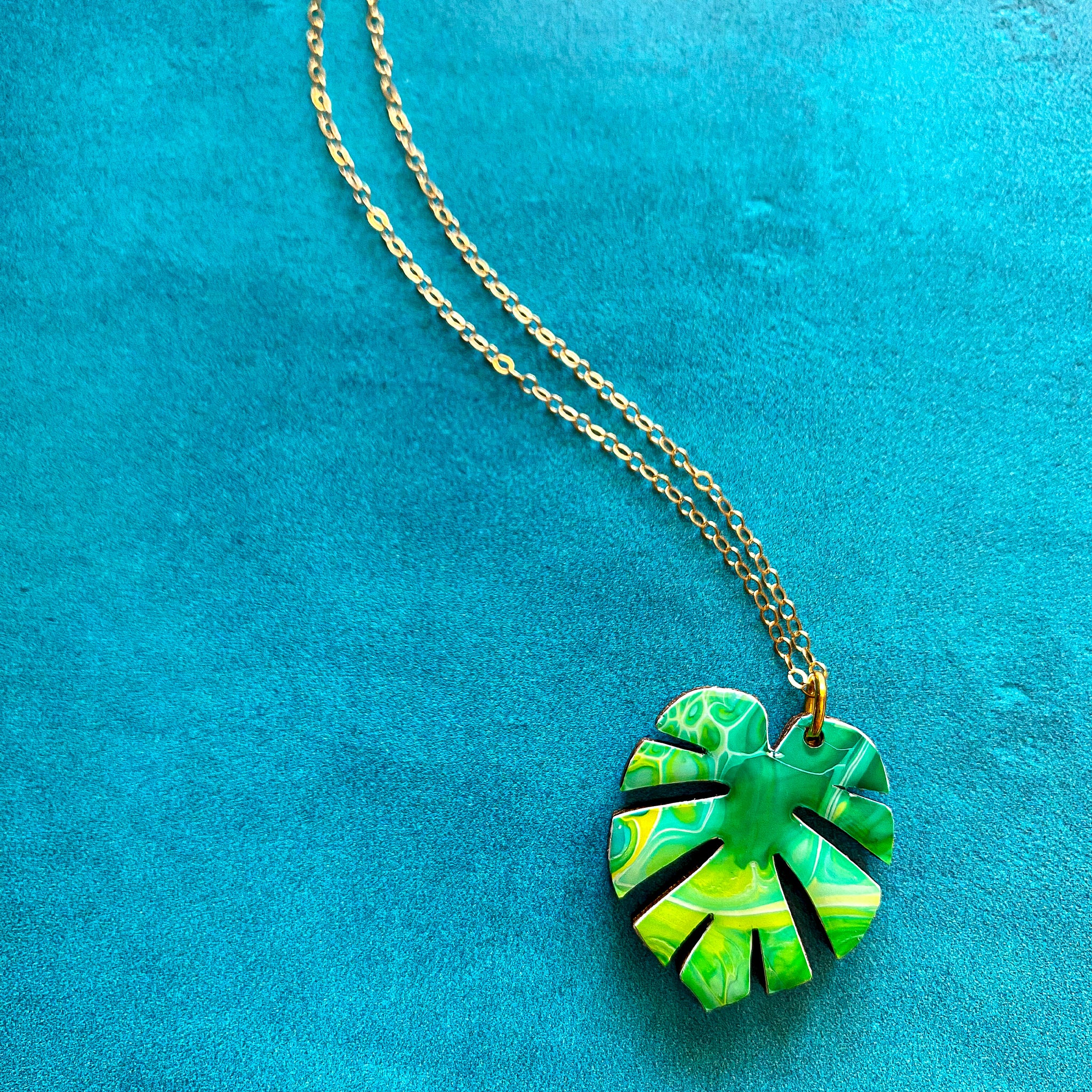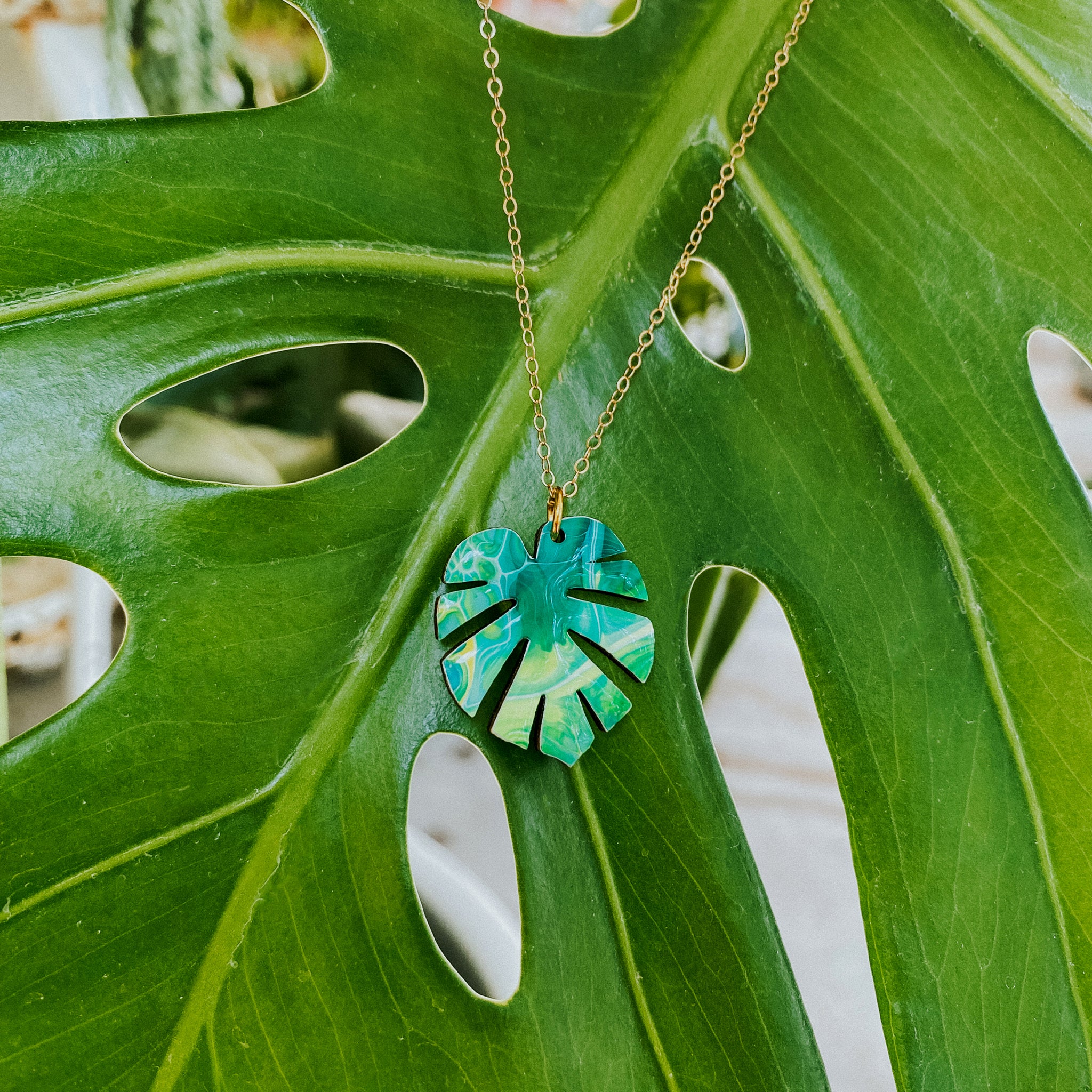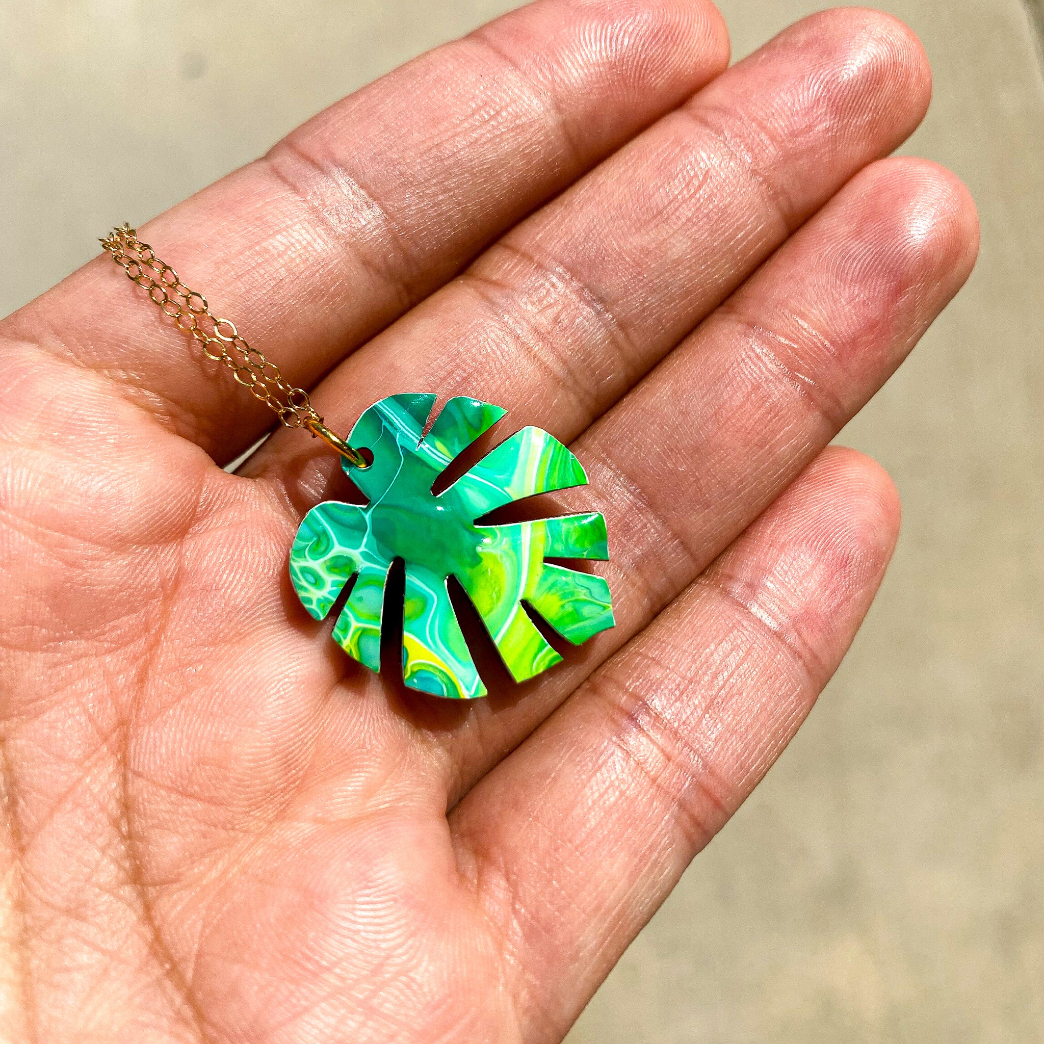 Handmade acrylic pour monstera leaf wood necklace. Each necklace is crafted by hand using leftover paint and drips poured from my original paintings and sealed with UV resin. Each piece is unique and one of a kind. Colors may vary due to monitor settings.