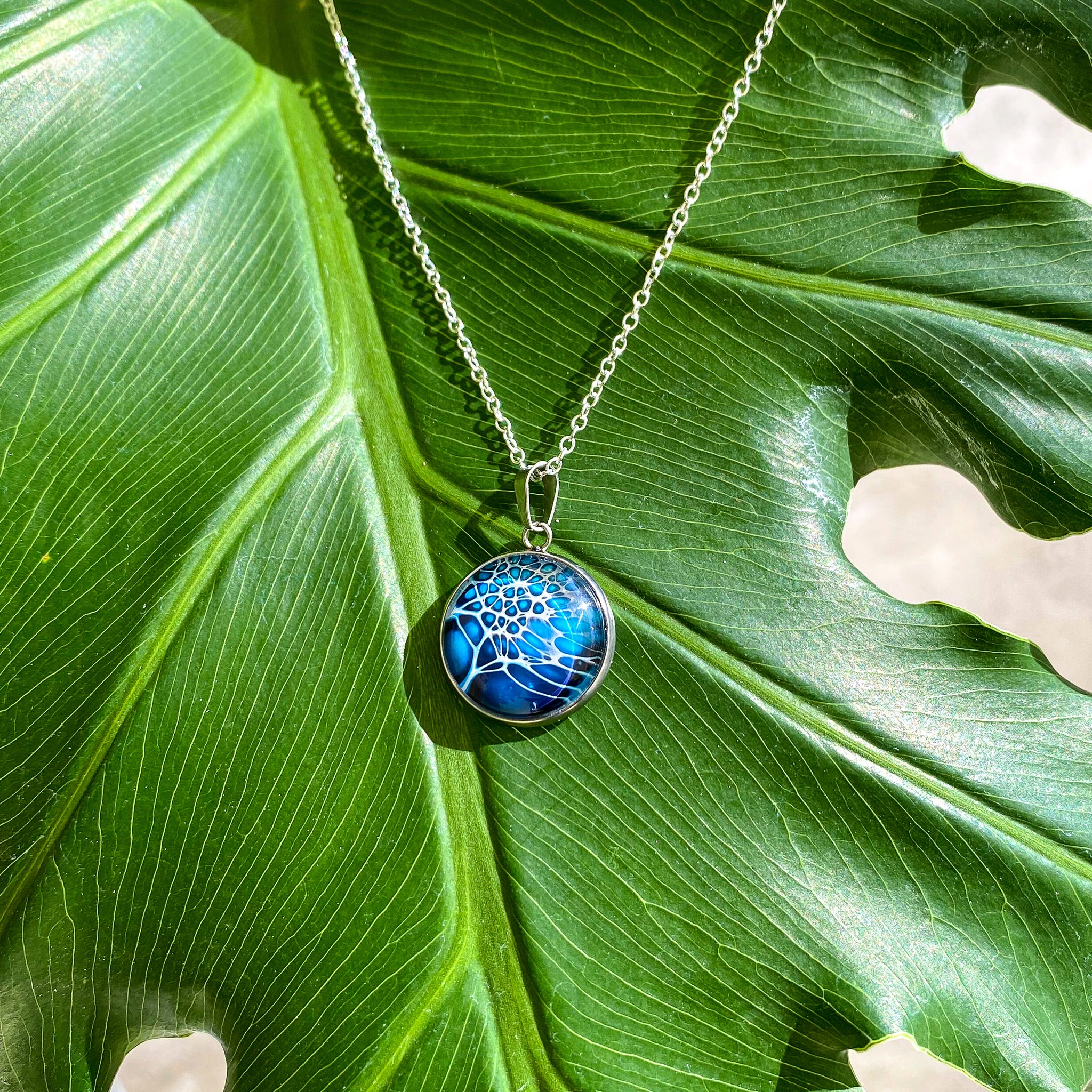 Handmade acrylic pour necklace in a round stainless steel pendant. Each necklace is crafted by hand using leftover paint and drips poured from my original paintings and are sealed in a glass cabochon. Each piece is unique and one of a kind. Colors may vary due to monitor settings.