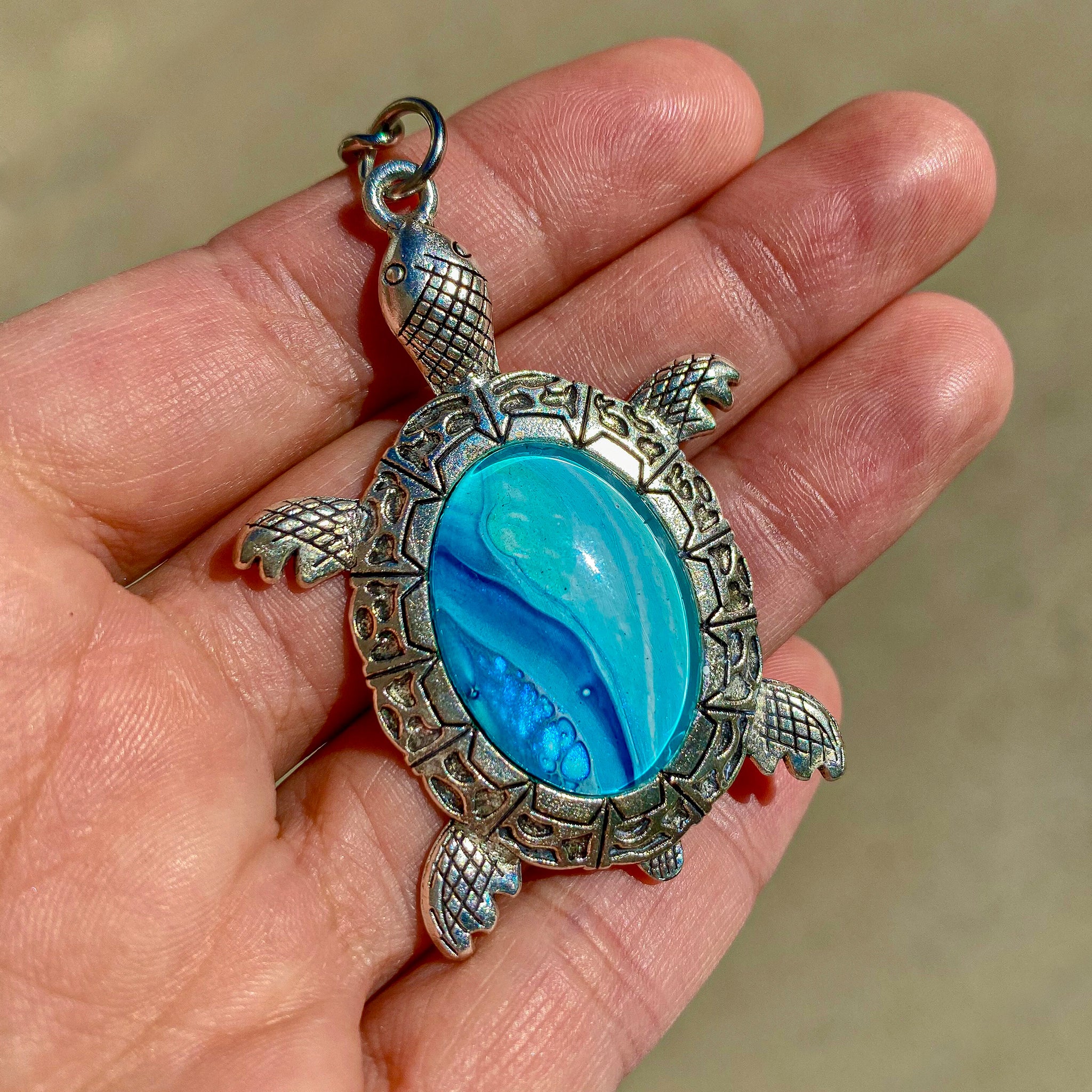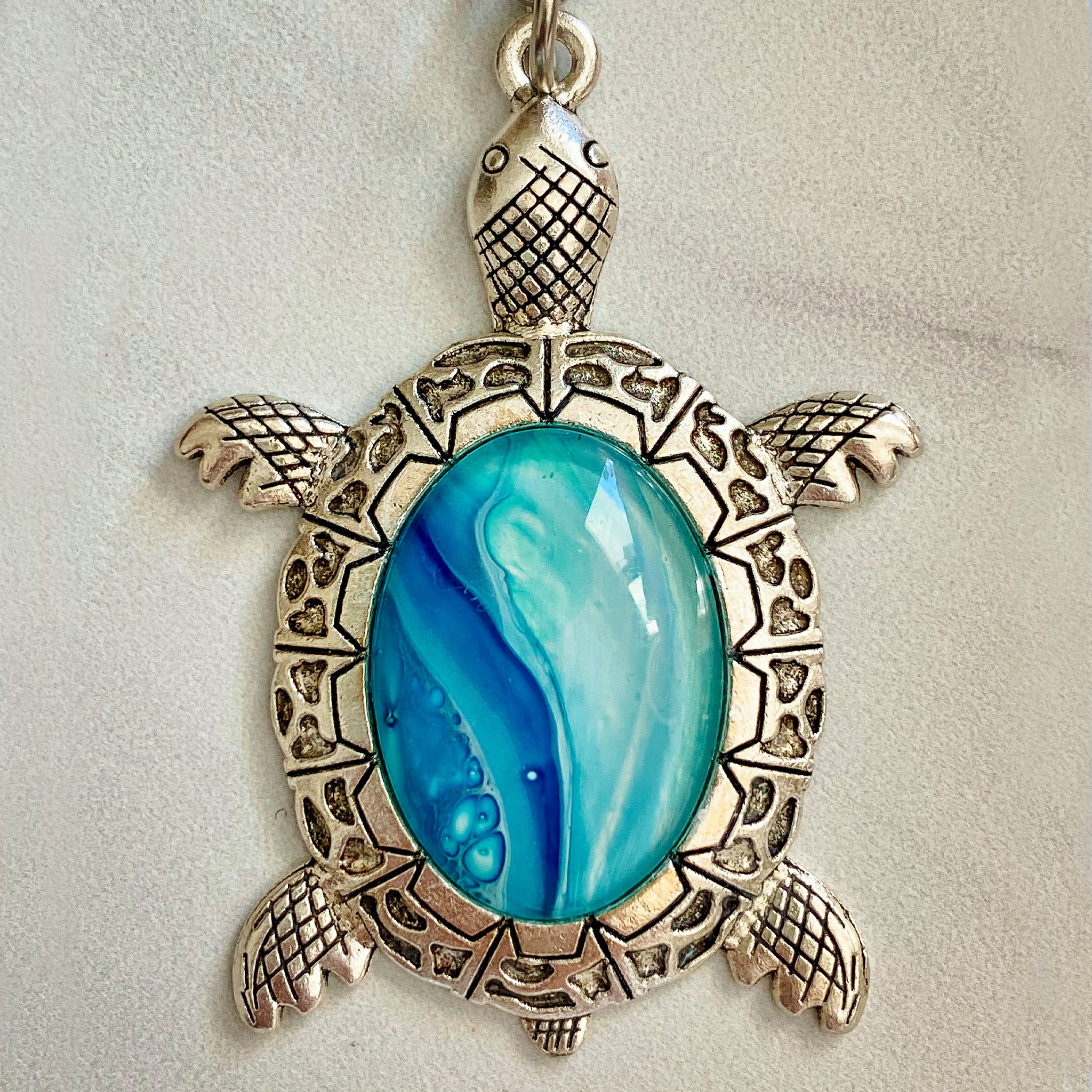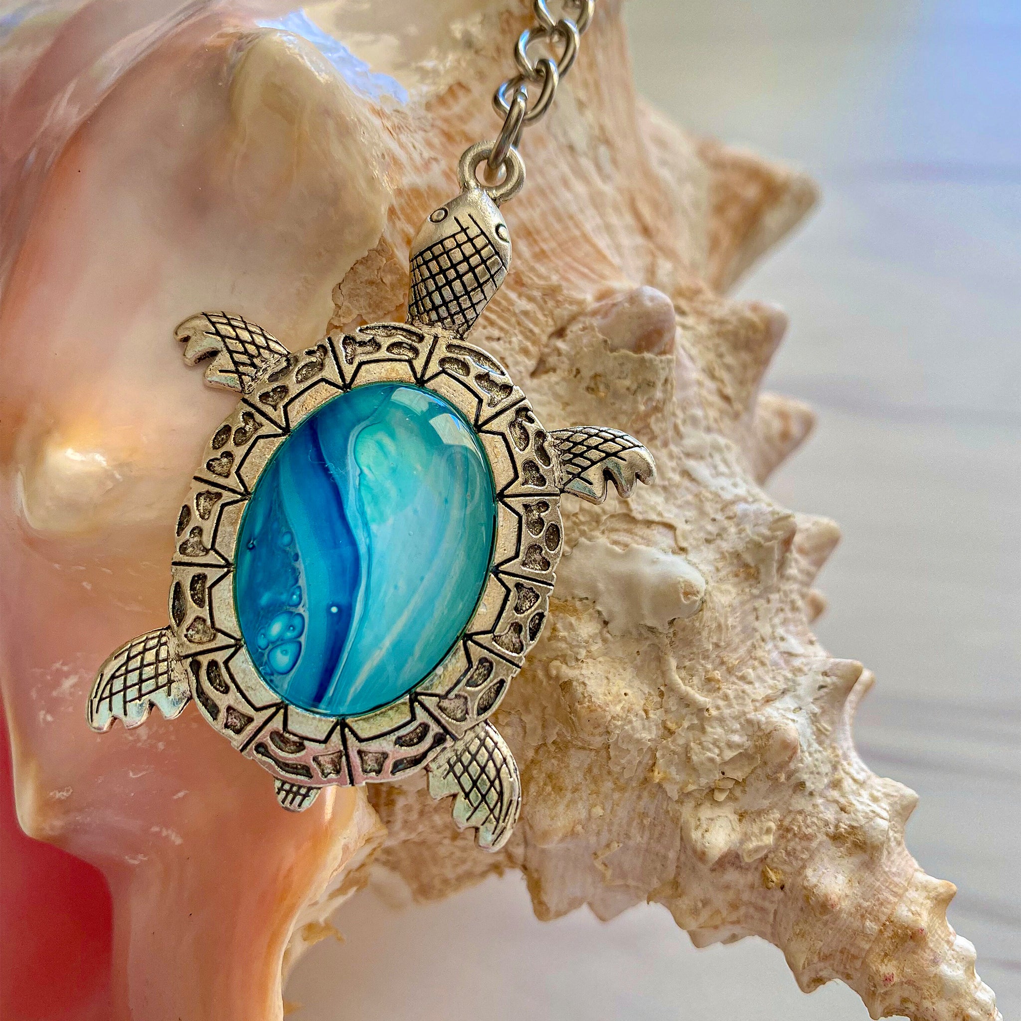 Handmade sea turtle keychain in a stainless steel silver pendant. Each turtle is crafted by hand using leftover paint and drips poured from my original paintings and are sealed in a glass cabochon. Each piece is unique and one of a kind. Colors may vary due to monitor settings.