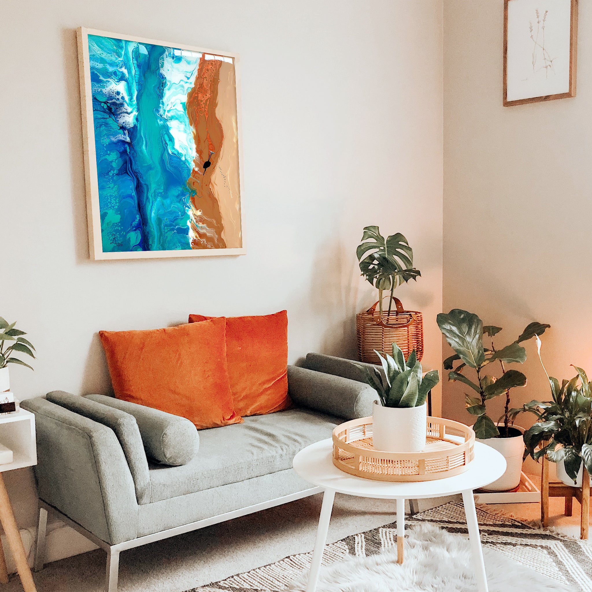This is an original piece. Images in the shop are mockups and not to scale. We recommend measuring your space to ensure this painting will be a good fit for your wall. We do not accept returns or exchanges on original paintings. If you have any problems with your order, please feel free to contact me.