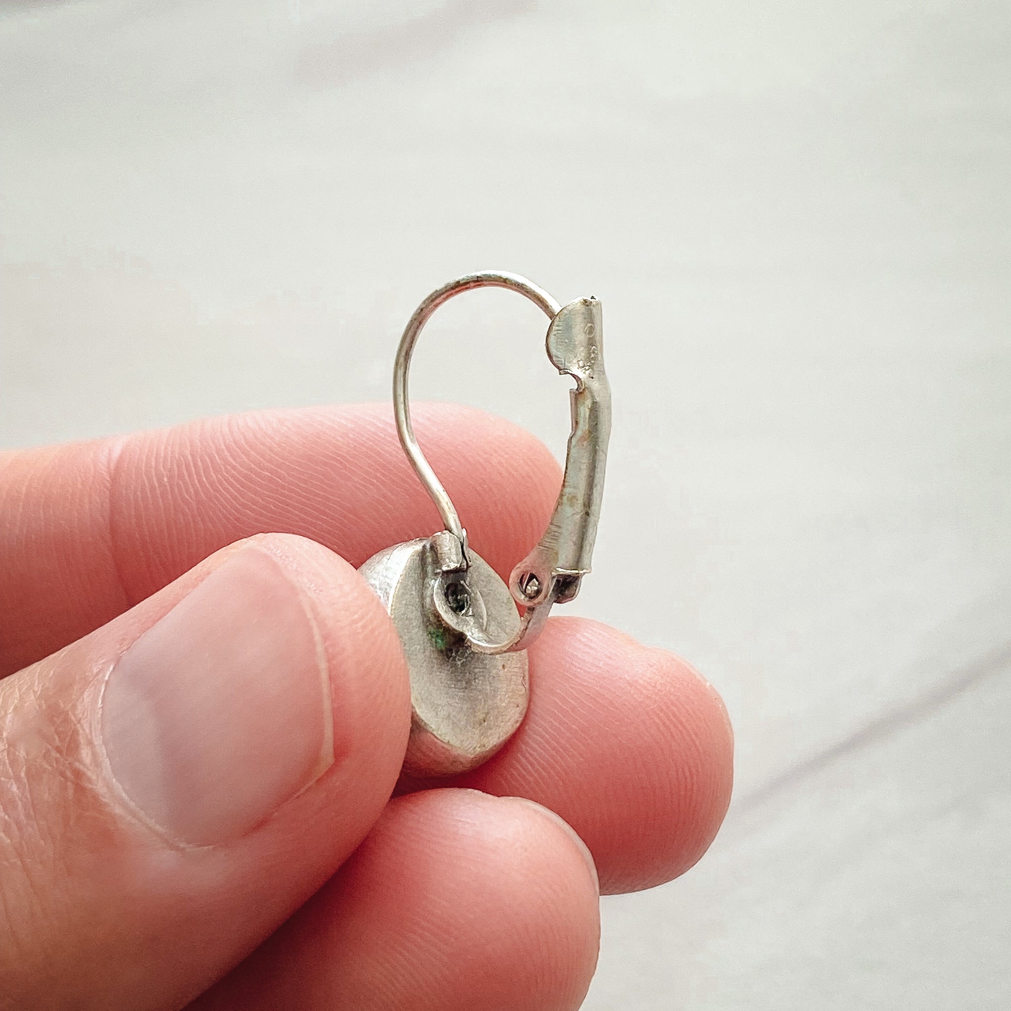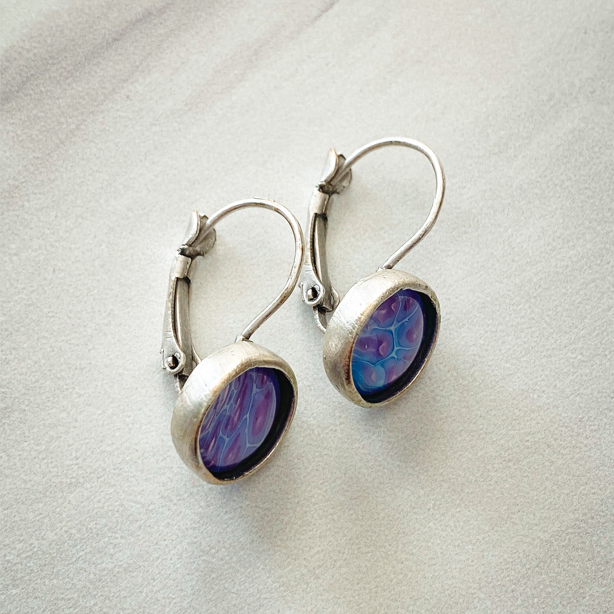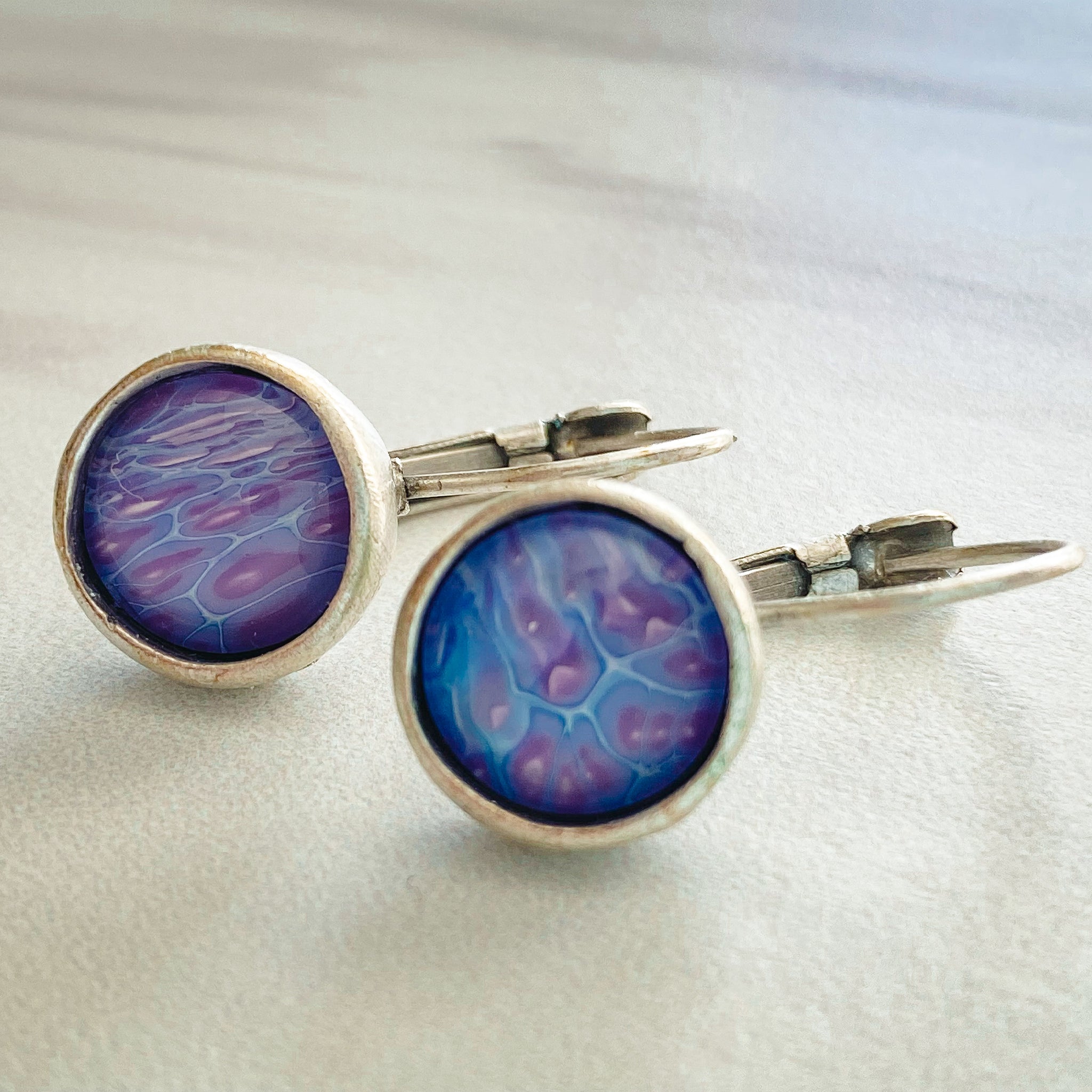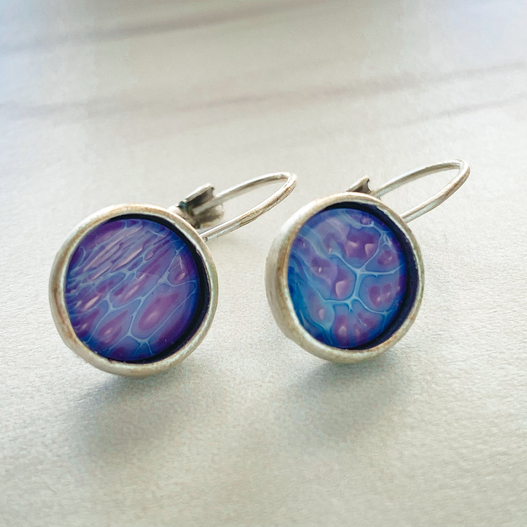 Handmade round earring set in an antique silver plated brass base. Each piece is crafted by hand using leftover paint and drips poured from my original paintings and are sealed in a glass cabochon. Each piece is unique and one of a kind. Colors may vary due to monitor settings.