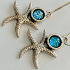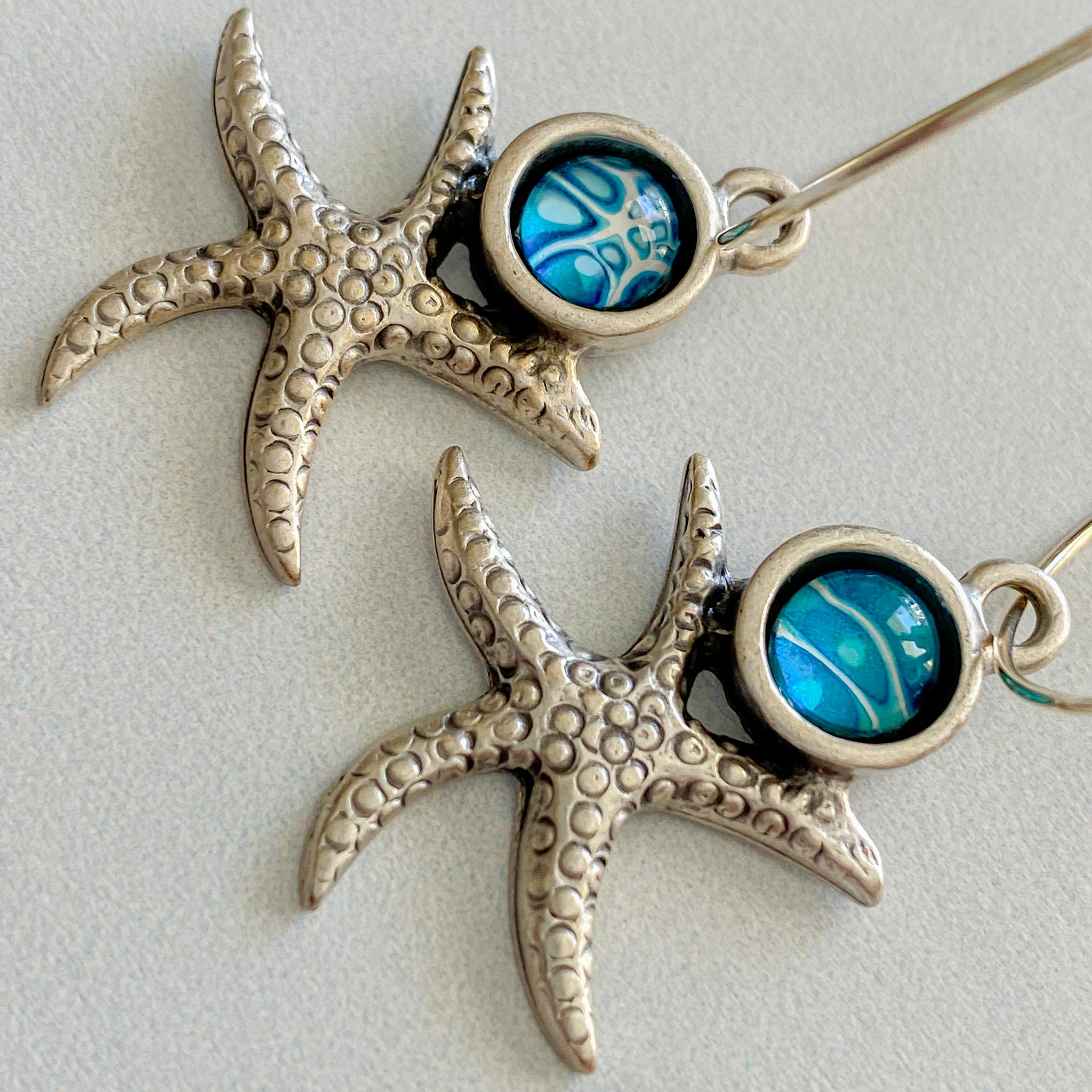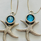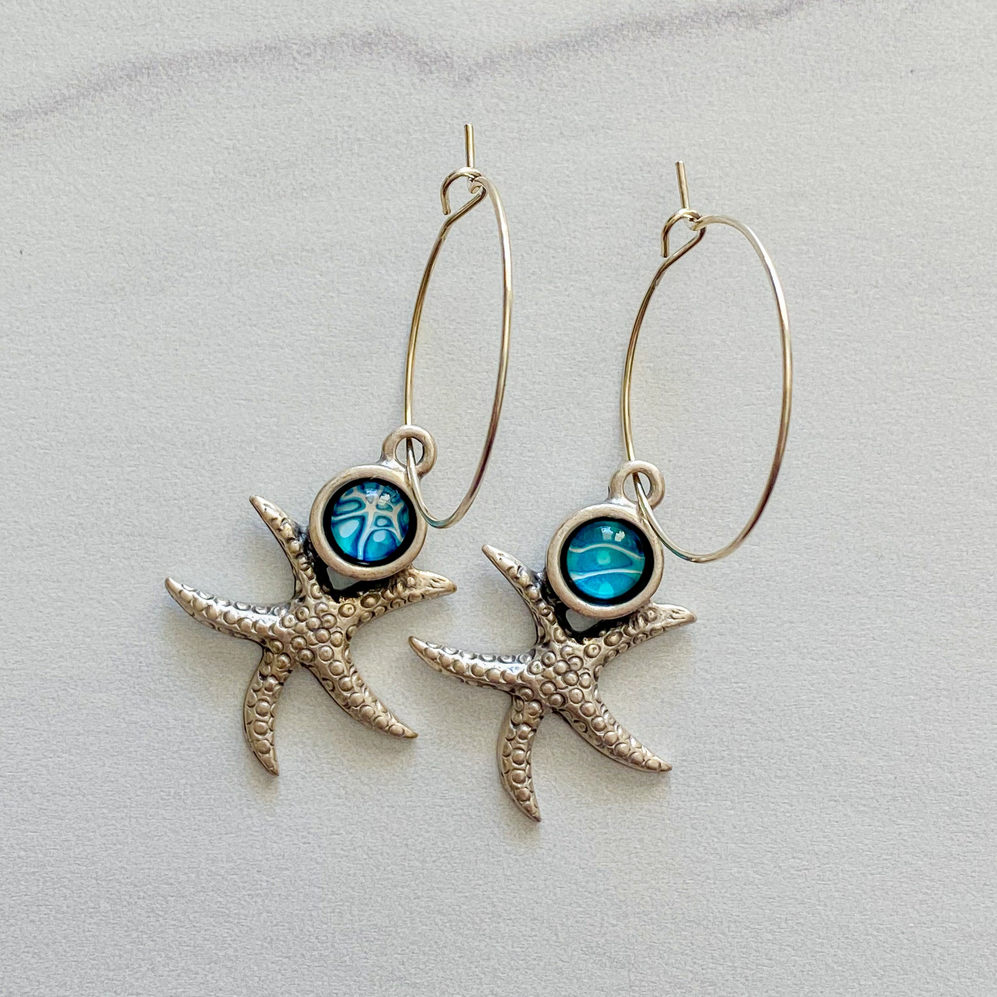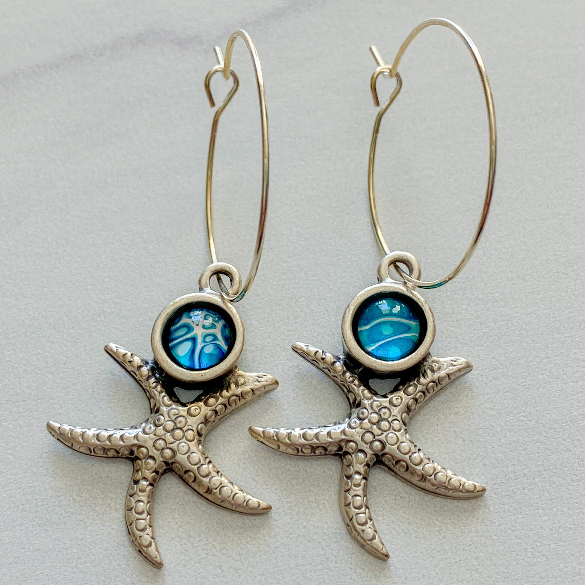 Handmade starfish silver plated hoop earring set. Each piece is crafted by hand using leftover paint and drips poured from my original paintings and are sealed in a glass cabochon. Each piece is unique and one of a kind. Colors may vary due to monitor settings.